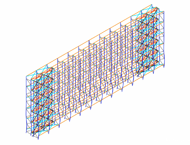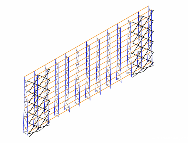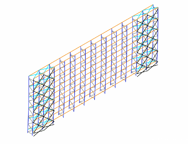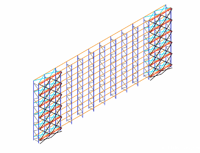 双排货架垂直拉杆(黑色)+横梁间水平拉杆(青色)+背靠背处两排货架间水平拉杆(红色),屈曲系数16.561:货架的屈曲模态为层间屈曲变形,屈曲系数明显提升,达到无侧移结构要求,垂直拉杆有效。