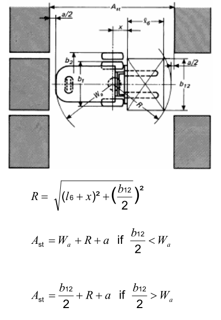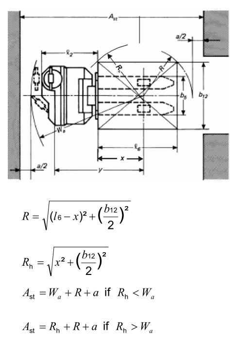 二、其次确定叉车操作容差a(见上面各图所示),一般为200mm。当存储单元尺寸异常导致操作与堆垛困难、生产率要求或叉车驾驶员技能水平变化时,应适当增大a的值。