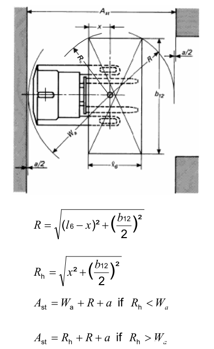 欧洲行业标准FEM 4.005(E),规定了几种主流类型的工业叉车进行90°堆垛时,对巷道宽度的要求。